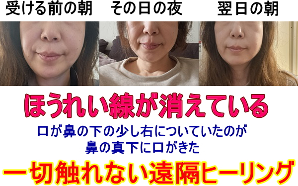遠隔ヒーリングなのに、ほうれい線が薄くなり、輪郭が全然違います。内臓、痛みや怠さなくなりました